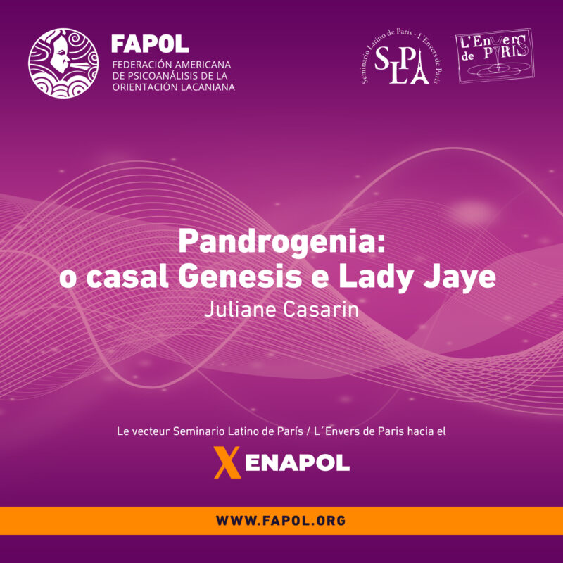 O casal formado por Genesis Breyer P-Orridge e Lady Jaye nos ensina que, no inconsciente, não existe à priori para se posicionar enquanto homem ou mulher. Do encontro contingente, fulgurante, entre esses dois seres falantes, surgiu uma história de amor. Desse amor, nasceu um projeto, a Pandrogenia. Este projeto é uma construção sinthomática que uniu o casal em seu exílio singular.